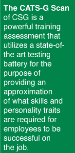 CSC’s CATS-G scan is a powerful training and assessment tool that identifies the skills and behavioral patterns required for employees to be successful at their work. The CATS-G scan enables an organization to identify what makes their high performing employees successful.