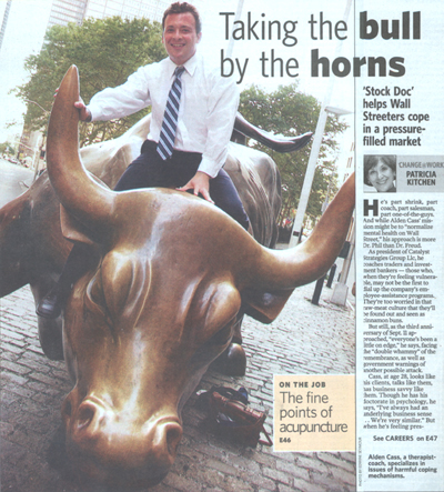 Among those he's seen: an investment banker abusing ritalin and cocaine just to get himself through the long days; a trader stuck in "behavioral paralysis" (Cass' code phrase for depression); another trader who started looking to alcohol for solace after his earnings plummeted from $125,000 to $50,000 when he changed jobs. Says his friend Matthew Albano, a lawyer-turned-broker, "Alden's just like the guys he's talking to. He's the same age. He's a single guy." In fact, before he knew him well, Albano heard Cass talking about his work and says, "I thought it was a pick-up line."
