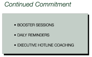 As relating to our four phase Top Performer Profiling SystemSM and CATS-G Scan process, CSC offers booster sessions at 3 and 6 months after our intervention has concluded. Additionally daily reminders such as motivational tapes, e-mails, and calendars are used to maintain the newly learned skills. Executive hotline coaching is also available in 6 and 12 month packages to handle on the spot work-related stressors. CSC also has affiliations with other executive coaching facilities in your area to handle significant problems that may arise after our implementation phase has concluded.