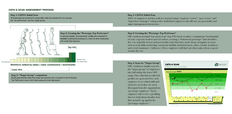 CSC´s CATS-G scan is a powerful training and assessment tool that identifies the skills and behavioral patterns required for employees to be successful at their work. The CATS-G scan enables an organization to identify what makes their high performing employees successful and uncovers the skills that need improving in their low to moderately productive employees. Items were selected based on empirical research methods and experiential interactions within the financial services industry.